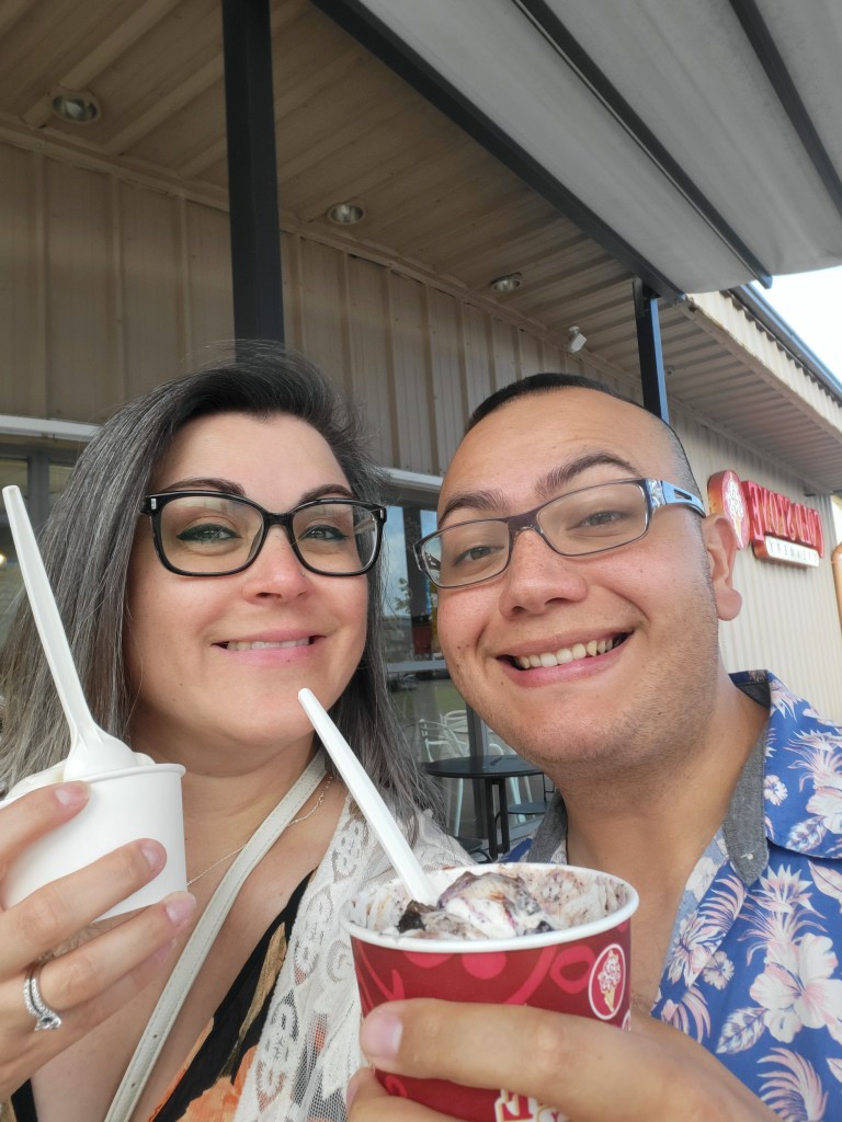 We went for dessert BEFORE dinner. I had Nik try (okay, we split it!) a cinnamon and sugar pretzel from Auntie Anne’s because I told him when I think of that place, I get a taste for dessert. I never go for the actual plain pretzel (I’m not a fan of all that salt). He gave the sweet pretzel a thumbs up. We then headed to the place he said he wanted to go to: Cold Stone Creamery. We enjoyed a cup of ice cream outside on the patio.
