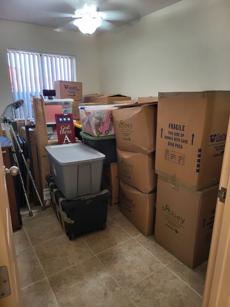 The day finally came for our household goods (HHG) to arrive here in Guam. It was an entire process, truthfully. Our things left our home on May first and didn’t arrive in Guam until the end of June. Everything had to go through customs so that took a little longer. Our things sat there for nearly 2 weeks before they set up a delivery date for our things. Movers came late in the afternoon on Wednesday, July 10 and we were EXCITED! We weren’t happy with the time as they told us they would be arriving early morning, but regardless, it was here! It was raining some off and on so we moved Rosie from our garage so they could use that area for temporary storage and quick moving out of the rain. The movers were very kind, and things were quickly moved in. Most of our boxes we put into one of our spare bedrooms to be out of the way. We decided we would unpack things ourselves rather than have the movers do it. We can’t imagine how much time that would have taken had we had them do that. They did help with bigger furniture and moving things of that nature where we wanted them.