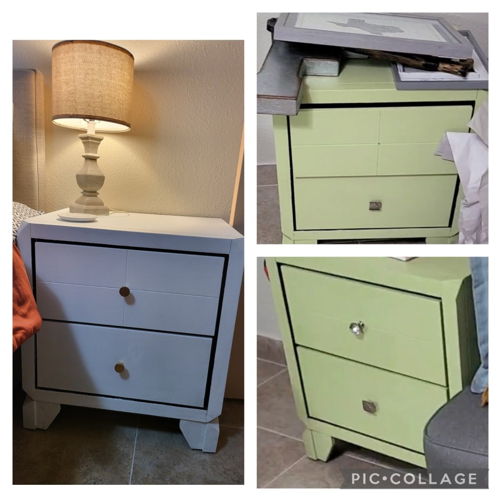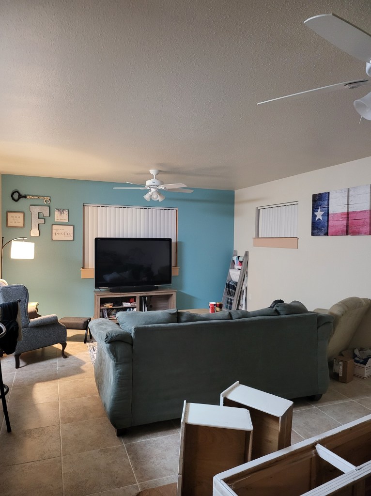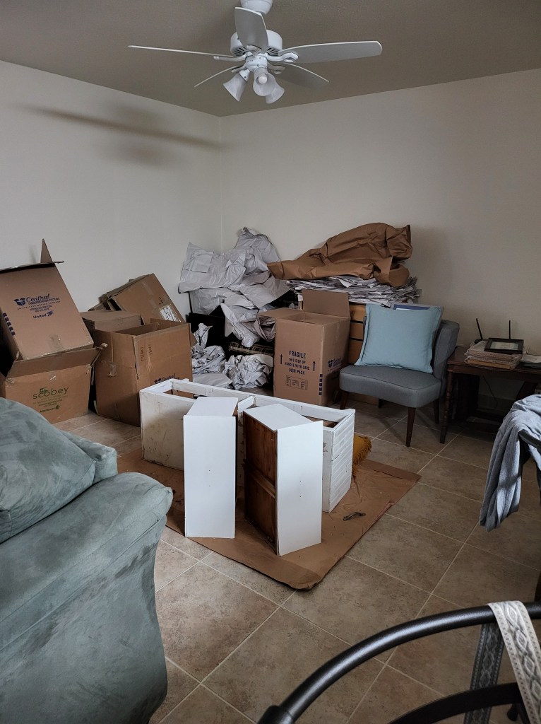 The boxes and paper have taken over our dining area, for now. It is pretty crazy how much paper is used to wrap things. While we are appreciative of the Texas packer’s gentleness and care of our things, we both agree it was overkill. Our dining area is a place for extra paper, boxes, and any project Syd have going on. Syd has painted an accent wall in our home. She gave 2 nightstands we got from a neighbor a makeover to go with our colors in our bedroom. She’s currently working on scraping the paint off an old bench-like shelf to repaint white (shown above) and possibly put new knobs on it. We snagged a FREE dining room table with 6 chairs that need LOTS of TLC so we’ll be recovering the seats and scrubbing the chairs and table clean. We are just thankful for all these things that were either given to us or we got at a steal of a price. We’re sure it’ll take another month or so before we are fully settled with any remnants of this move completely removed from our space.